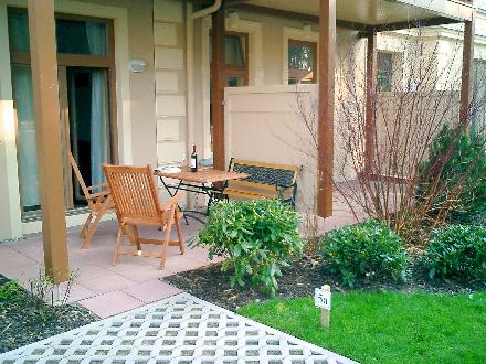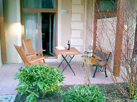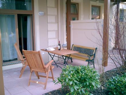 Die ebenerdige Terasse mit dem Gartenteil liegen nach Westen. Durch die geschmackvolle Einrichtung können Sie Ihr Frühstück hier geniesen oder aber in der Sonne entspannen, die sich ab Mittag auf der Grundstücksfläche zeigt. Sehr reizvoll ist auch der Tagesausklang im Abendrot.